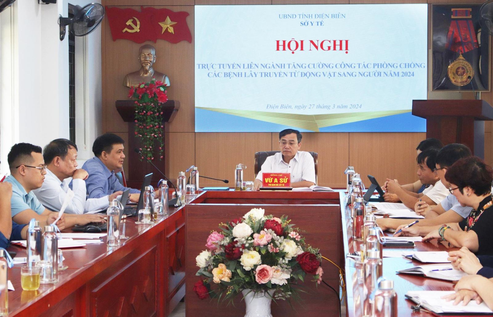 Ngày 27/3, Bộ Y tế phối hợp Bộ Nông nghiệp và Phát triển nông thôn tổ chức Hội nghị trực tuyến liên ngành tăng cường công tác phòng, chống các bệnh lây truyền từ động vật sang người năm 2024 với sự tham gia của 63 tỉnh, thành trong cả nước. Thứ trưởng Bộ Y tế Nguyễn Thị Liên Hương và Thứ trưởng Bộ Nông nghiệp và Phát triển nông thôn Phùng Đức Tiến, chủ trì Hội nghị. Tại Điểm cầu tỉnh Điện Biên, đồng chí Vừ A Sử, Phó Giám đốc Sở Y tế chủ trì hội nghị.