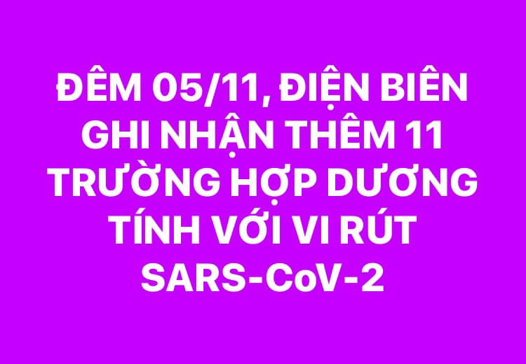 05/11/2021Tính từ 10h00 đến 22h00 ngày 05/11, trên địa bàn tỉnh Điện Biên ghi nhận thêm 11 trường hợp có kết quả xét nghiệm dương tính với vi rút SARS-CoV-2, nâng tổng số ca mắc trong ngày lên 19 ca.