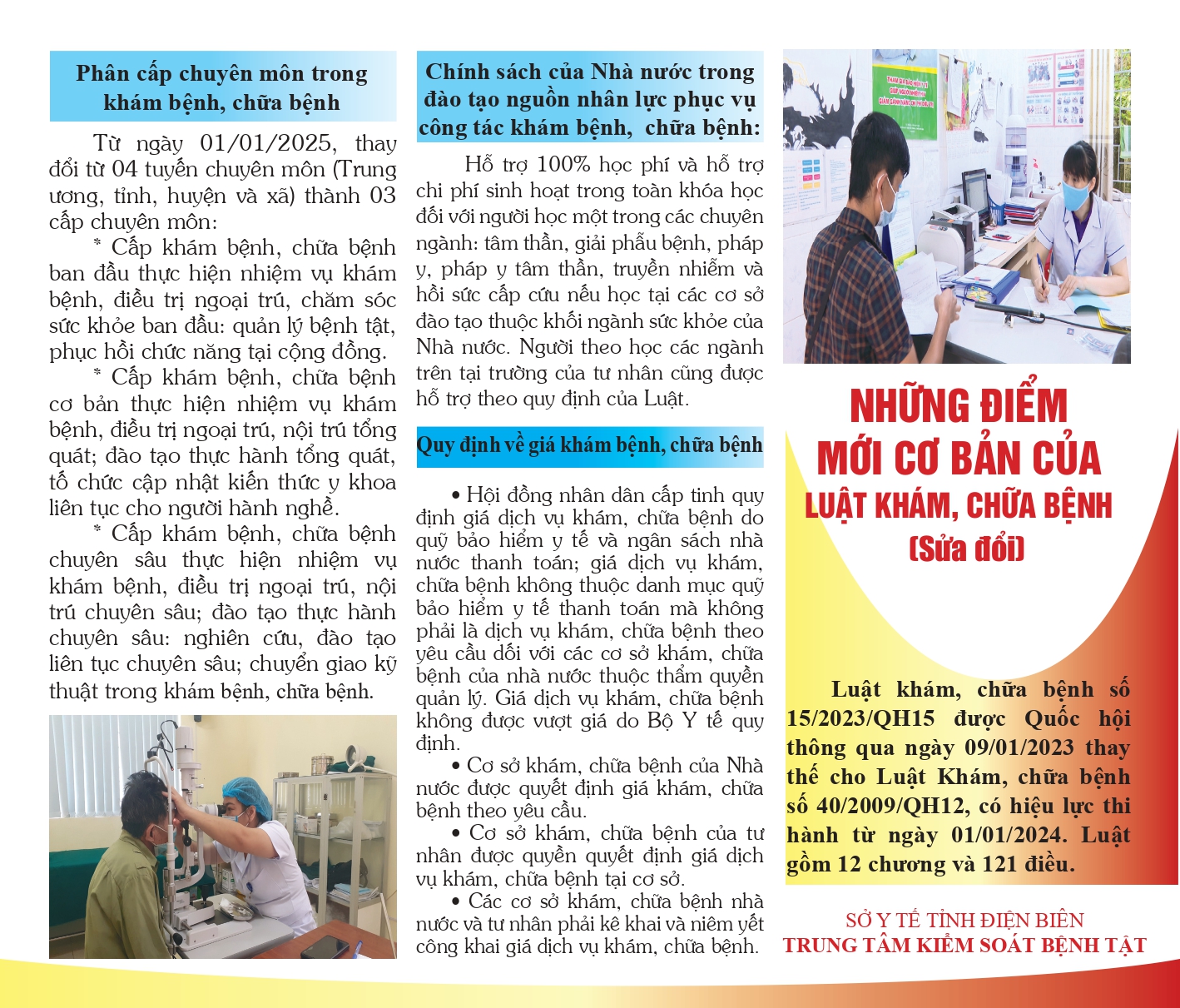 05/03/2024Luật Khám, chữa bệnh số 15/2023/QH15 được Quốc hội thông qua ngày 09/01/2023 thay thế cho Luật khám, chữa bệnh số 40/2009/QH12, có hiệu lực thi hành từ ngày 01/01/2024. Luật gồm 12 chương và 121 điều.