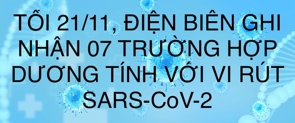 21/11/2021Tính từ 11h00 đến 19h00 ngày 21/11, trên địa bàn tỉnh Điện Biên ghi nhận thêm 07 trường hợp có kết quả xét nghiệm dương tính với vi rút SARS-CoV-2 tại thành phố Điện Biên Phủ, huyện Mường Nhé và huyện Điện Biên.