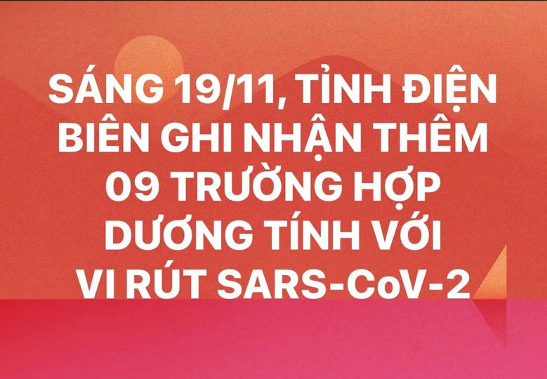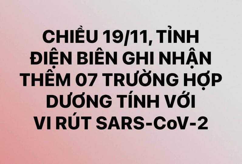 19/11/2021Hồi 15h20 ngày 19/11, trên địa bàn tỉnh Điện Biên ghi nhận thêm 07 trường hợp có kết quả xét nghiệm dương tính với vi rút SARS-CoV-2 tại thành phố Điện Biên Phủ và huyện Điện Biên.