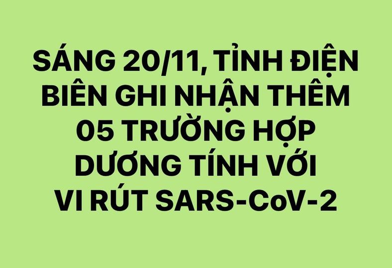 20/11/2021Hồi 09h00 ngày 20/11, trên địa bàn tỉnh Điện Biên ghi nhận thêm 05 trường hợp có kết quả xét nghiệm dương tính với vi rút SARS-CoV-2 tại huyện Điện Biên Đông; thành phố Điện Biên Phủ và huyện Mường Chà.