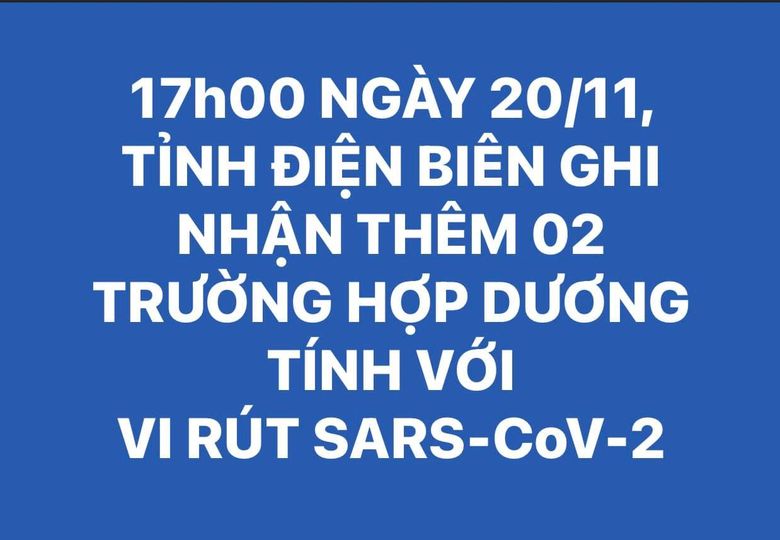 20/11/2021Hồi 17h00 ngày 20/11, trên địa bàn tỉnh Điện Biên ghi nhận thêm 02 trường hợp có kết quả xét nghiệm dương tính với vi rút SARS-CoV-2 tại thành phố Điện Biên Phủ và huyện Điện Biên Đông.