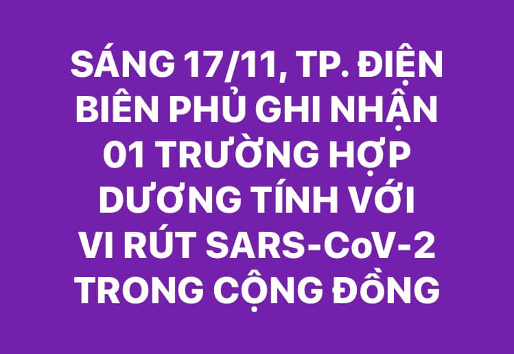 17/11/2021Hồi 02h00 ngày 17/11, trên địa bàn tỉnh Điện Biên ghi nhận thêm 01 trường hợp có kết quả xét nghiệm dương tính với vi rút SARS-CoV-2 tại thành phố Điện Biên Phủ.