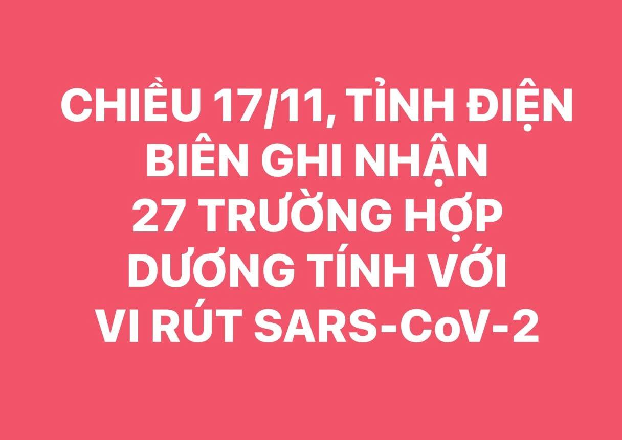 17/11/2021Chiều ngày 17/11, trên địa bàn tỉnh Điện Biên ghi nhận thêm 27 trường hợp có kết quả xét nghiệm dương tính với vi rút SARS-CoV-2 tại thành phố Điện Biên Phủ (21), huyện Điện Biên (5) và huyện Mường Nhé (1).