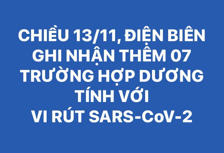 13/11/2021Từ 14h00 đến 17h00 ngày 13/11, trên địa bàn tỉnh Điện Biên ghi nhận thêm 07 trường hợp có kết quả xét nghiệm dương tính với vi rút SARS-CoV-2 tại huyện Điện Biên.