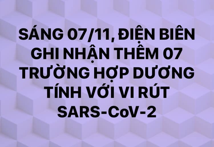 07/11/2021Tính từ 00h00 đến 10h00 ngày 07/11, trên địa bàn tỉnh Điện Biên ghi nhận thêm 07 trường hợp có kết quả xét nghiệm dương tính với vi rút SARS-CoV-2.